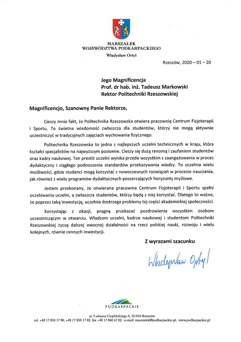 Otwarcia dokonał Rektor Politechniki Rzeszowskiej prof. dr hab. inż. Tadeusz Markowski. -Oddajemy dziś do użytku miejsce, które służyć będzie usprawnieniu ruchowemu studentów, którzy z uwagi na stan zdrowia nie są w stanie uczestniczyć w tradycyjnych formach wychowania fizycznego. Alternatywne formy zajęć WF-u są wprawdzie prowadzone w naszej Uczelni od ponad 30 lat, jednak Uczelnia się rozrasta - a co za tym idzie - z roku na rok przybywa studentów przebywających na długoterminowych  zwolnieniach lekarskich oraz studentów z niepełnosprawnościami. Podyktowało to konieczność rozbudowy specjalistycznej pracowni dedykowanej tej grupie studentów - powiedział prof. Markowski.