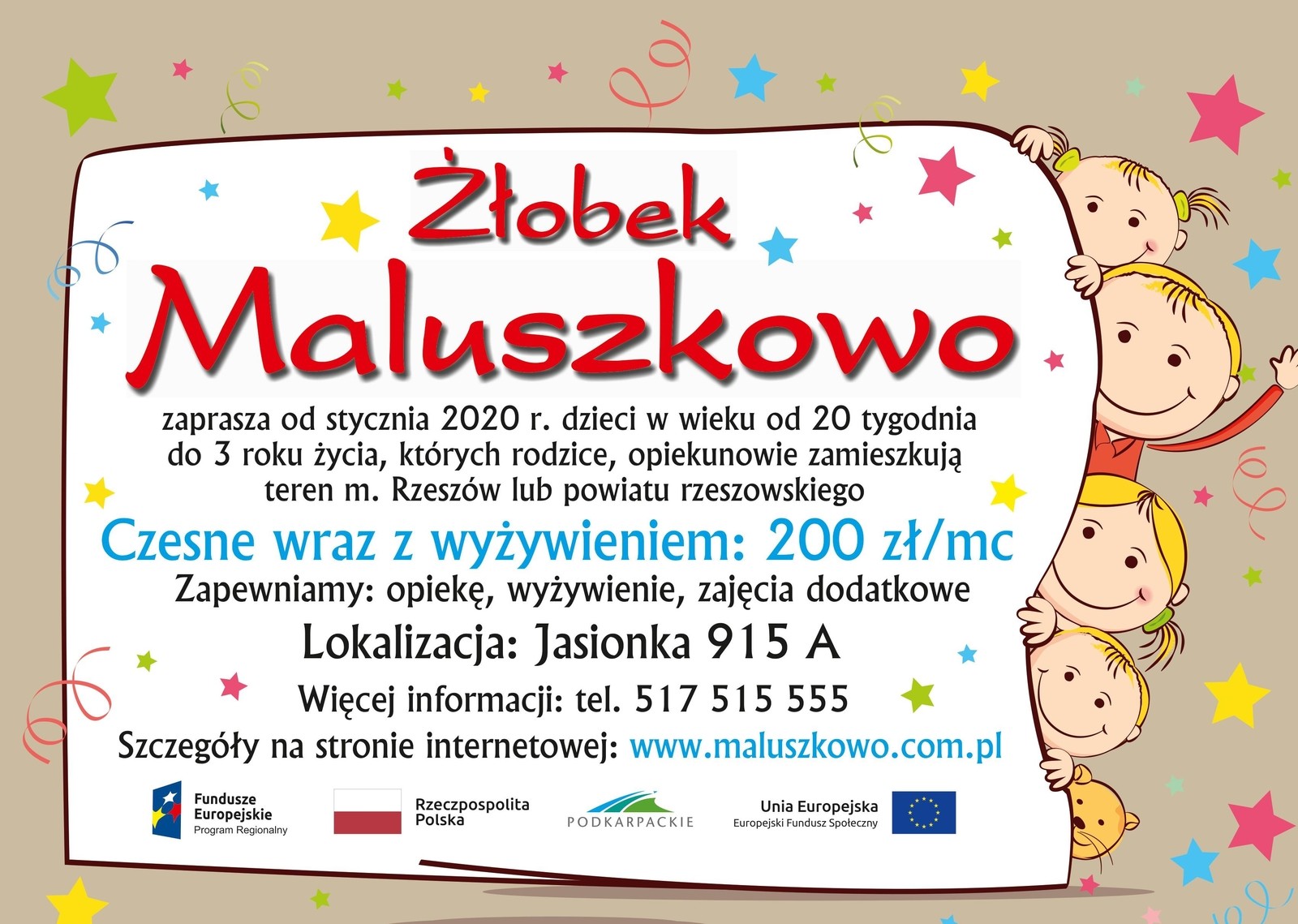 Lokalizacja: Jasionka 915 a. Więcej informacji pod numerem telefonu 517 515 555 oraz na stronie internetowej www.maluszkowo.com.pl